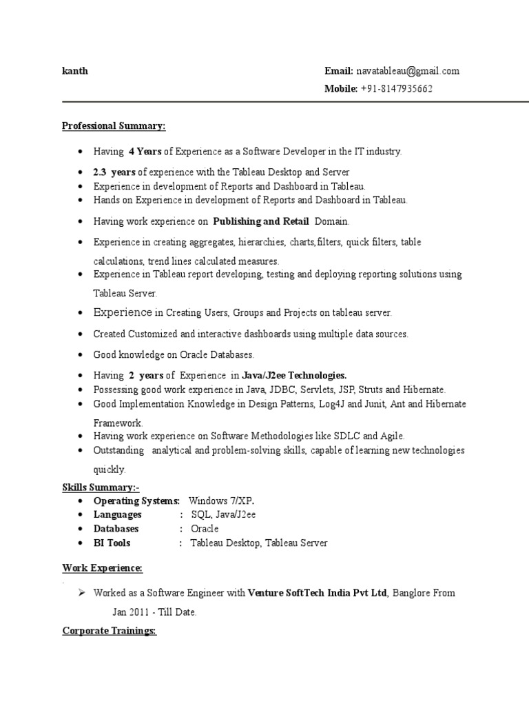 The following tableau developer sample resume is created using sleek resume builder. To write a professional tableau developer resume, follow these tips: Here this time we come with best growing technology tableau resume samples/template which will be. · your resume must depict your expert level knowledge of services in the tableau workbooks.